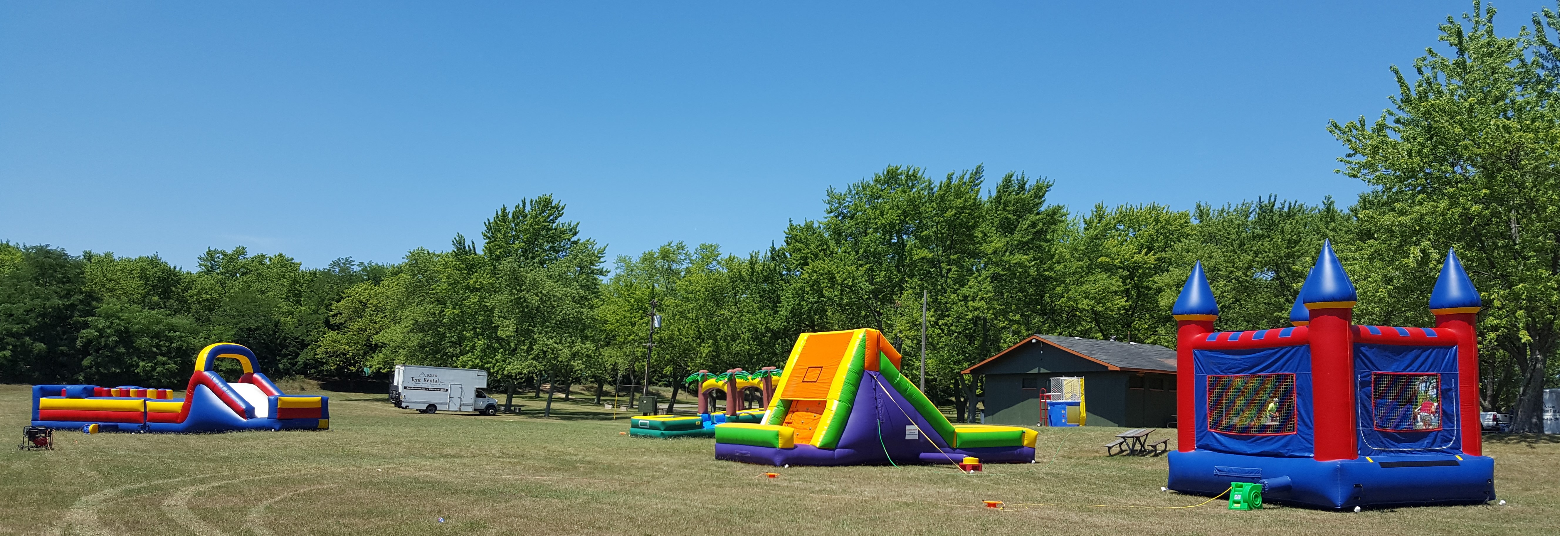 Right Side Photo: 12x12 Castle Bouncer That Can Be Added to the Obstacle Course and Slide to Create The Super Combo With All Three. Dunk Tank & Dual Lane Slip n Slide also Shown in the Background