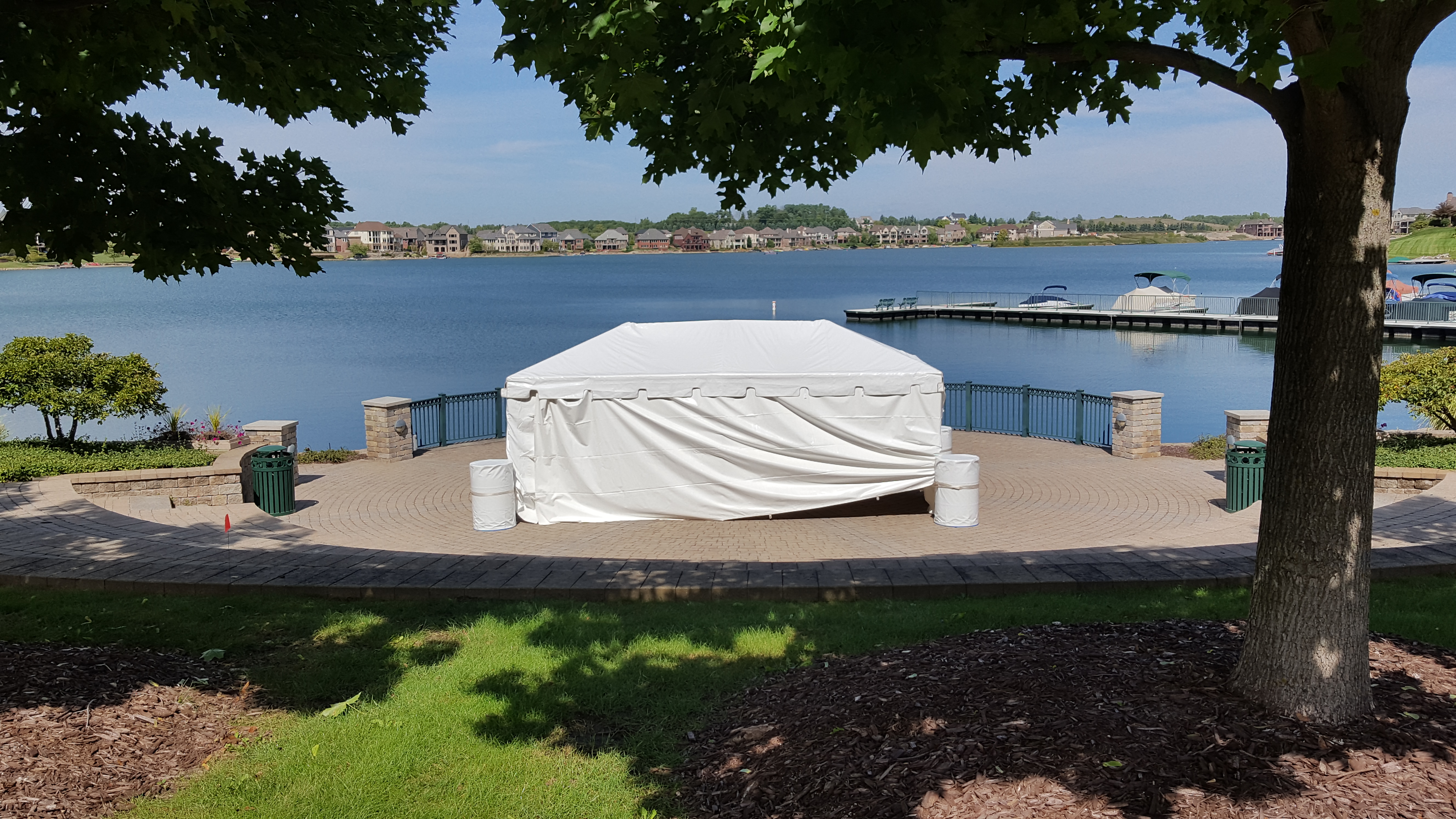 10x20 Frame Tent, with sidewalls, secured with water barrels at a picnic event in South Lyon.